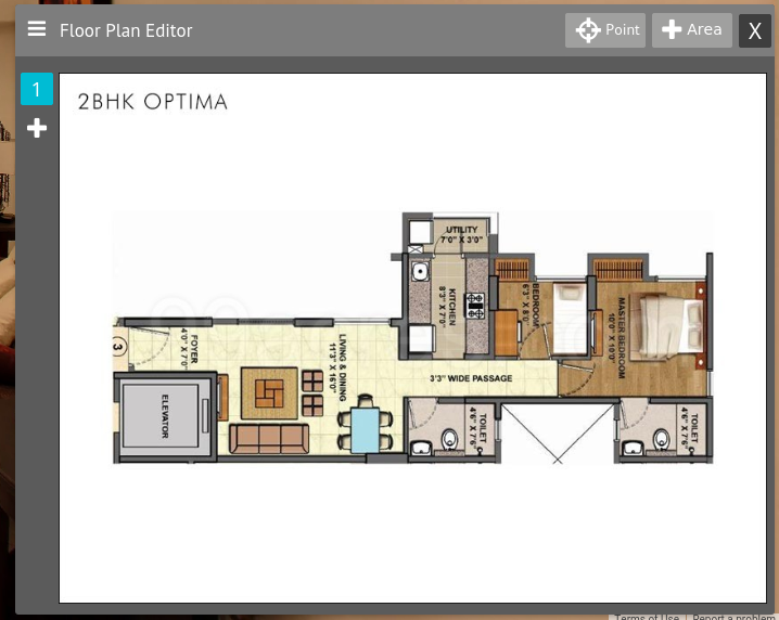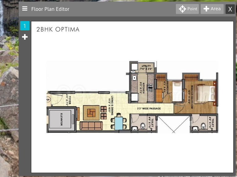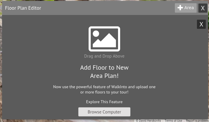 When you click on this icon, Walkinto will automatically create an empty floor plan , your first 'Area' and will give you a screen to upload your floor plan. Floor plan can be in any image format acceptable on the browser. we recommend a JPEG image re-sized to an acceptable small size so that your tour will load up faster.