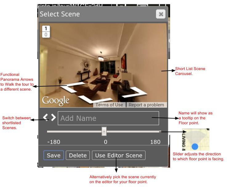 Clicking on the camera icon will add the current scene to the 'Short List carousel'. It is then accessible at multiple points during your scene selection process. For example while creating a scene link. We have used the same tool and the intuitive shortlist method to pick the scene attachments for 'Floor Points'.